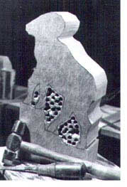 Pieres des Steatites in East Broughton, Quebec is the only mine I know that cuts the stone into a finished block. I do not intend to tell the reader what they should carve. I believe that the idea has to come from the mind of the carver. It will be a great deal easier if the carver can visualize the finished idea in the rough stone. There are aspects of carving that I can not write down in words, this one of them. When starting with a cut piece of stone, I first make a template of my idea and copy it to the stone. I do this because, I have found that after I finish the carving, I can use the template to make changes for the next carving. I never seem to be satisfied with a carving, as soon as I finish it, I find things that displease me. Copy the template on to the stone. I try to enlarge the template to get the most efficient use of the stone. I had used a pantograph for many years to do this. Today I use the computer to enlarge my templates. To remove large amounts on stone, use a saw. I have used every kind of saw from a crosscut to a hacksaw depending on the size of the stone. One of the benefits of working in soapstone is that it absorbs heat. This allows the sculptor to use a bandsaw to cut the stone. The stone will absorb a large portion of the heat generated by friction. This keeps the steel of the saw teeth from burning. The teeth of the saw blade will still wear. I use a "skip tooth" saw blade. This blade has half the teeth of a regular blade. This allows more stone dust to be carried the depth of the stone while you are cutting it. I make great use of a "Stanley", ("mini hack") hacksaw. This tool holds a hacksaw blade by one end, allowing the front of the hacksaw blade access to very confined areas, such as a drill hole. It is even more effective if you grind or break of the front end of the hacksaw blade. This will give you a cutting edge to the very front of the blade. The saw is used to remove large chunks of stone in order reshape the block of stone in order to better help you visualize the final carving. Try to keep in mind the symmetry of the carving as you cut. You may have areas that contain a lot of stone that you wish to remove in the middle of the piece. This can be done by a technique that I call "pointing". The masters of old would make a model of a sculpture that they intended to carve, this form could replicated in stone by drilling hundreds of holes into the marble. These holes will weaken the stone so it can be easily removed with the mallet and chisel.